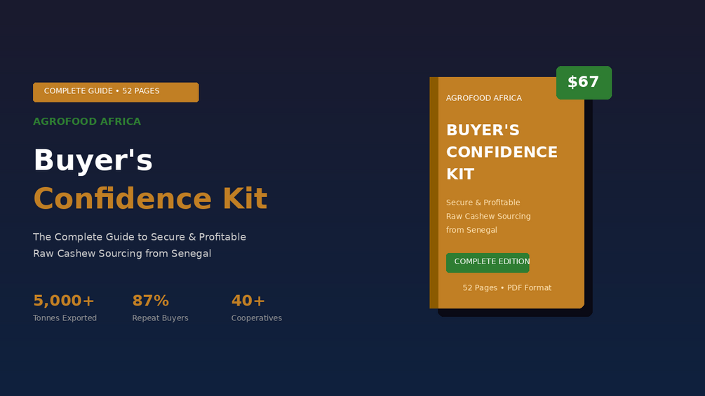 The complete 52-page guide to secure raw cashew sourcing from Senegal. Written by an actual exporter with 5,000+ tonnes shipped and 87% repeat buyer rate. Includes quality parameters, payment security, red flags checklist, 5 case studies, and 40+ FAQ.